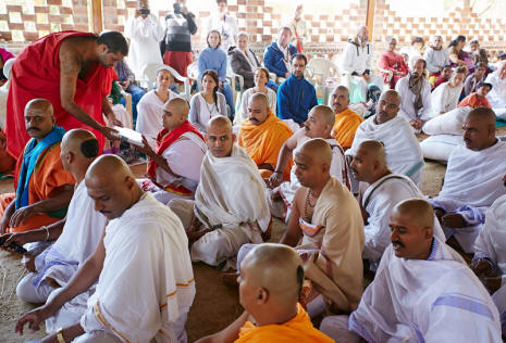 Next, the team of priests was assembled. In old days, someone would have gone from house to house, asking for the proper persons to participate in the Somayag. Today, the group has already been chosen and is present. They sit together and Achal, the Yajaman, asks each person if they agree to carry out their responsibility to complete the Somayag.